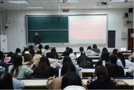 在梳理新中国发展脉络时,张亦佳老师以抗美援朝的浴血奋战、改革开放的破冰前行等关键节点为线索,结合小岗村“红手印”的改革勇气、深圳特区建设的创新实践等鲜活案例,生动诠释了中国共产党带领人民敢闯敢试、锐意进取的奋斗精神。同时,他将南财校史与国家发展同频共振,阐释学校在不同历史时期与国家命运休戚与共的发展历程,传递一代代南财人“厚德、博学、求真、笃行”的精神内核,让青年学子深刻理解个人成长、学校发展与国家富强的紧密联系。围绕新时代党的责任担当,他分享了优秀党员的先进事迹与中国科技自立自强的奋进故事,以疫情防控、抗洪抢险中党员冲锋在前的逆行身影,生动诠释了共产党人“随时准备为党和人民牺牲一切”的忠诚本色,强调自力更生、艰苦奋斗是新时代青年应有的精神品格。