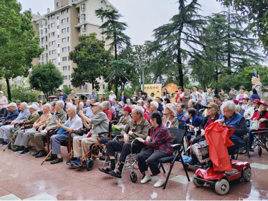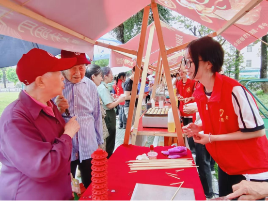 合唱团献唱《万疆》,“红日升在东方,其大道满霞光”的旋律回荡现场,真挚歌声既颂祖国山河壮阔,又寄寓国庆祝福,引发经历过峥嵘岁月的老兵们强烈共鸣,掌声与轻声和唱交织,国庆氛围格外浓厚。演出后,志愿者协助工作人员维持秩序,引导老人参与各项游园会项目打卡,加盖纪念章、分发印有家国元素的节日纪念品,更围坐倾听老兵讲述过往奋斗故事,在忆往昔、话今朝中传递青春敬意,共盼国庆。